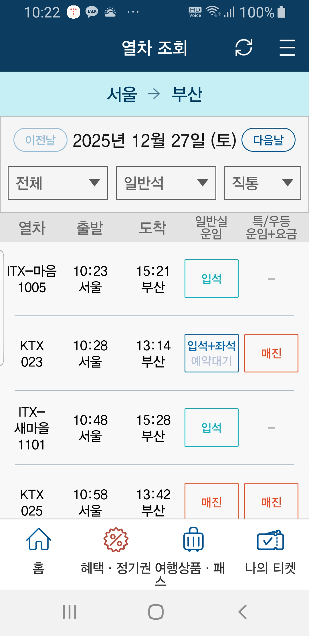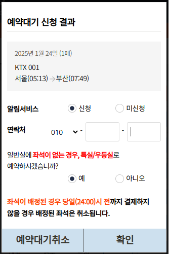 상황에 따라 전 구간 좌석으로 배정되는 경우도 있어서 저는 항상 대기를 걸어두는 편이에요.